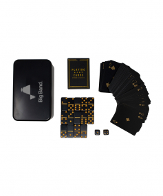 Pass the time with our portable games kit! Included in this customizable gift tin are luxe dominoes, dice, and playing cards. This kit is easy to bring with you on road trips or flights for games night no matter where you are. 4.1" W x 6.7" L x 3.2" H